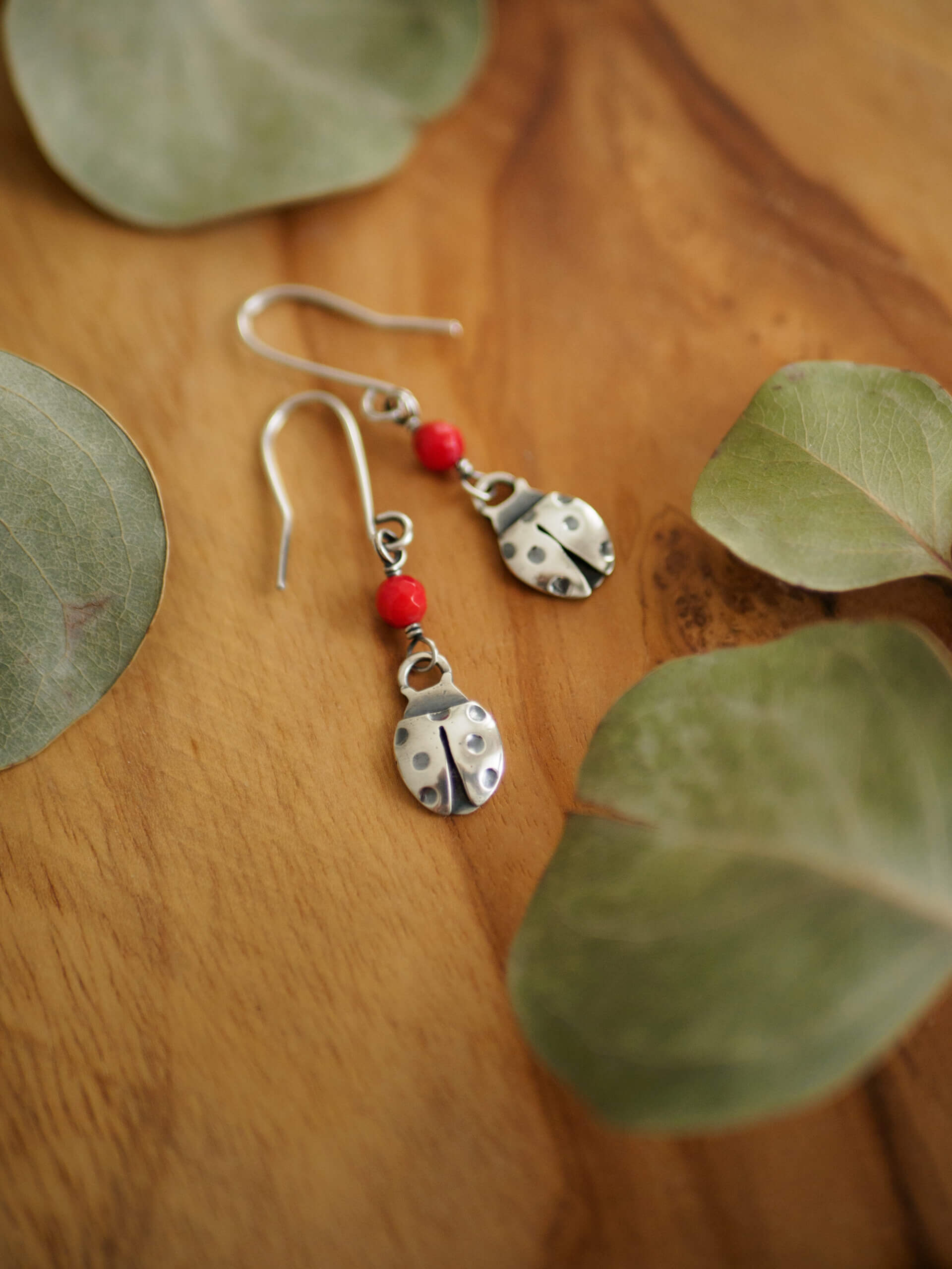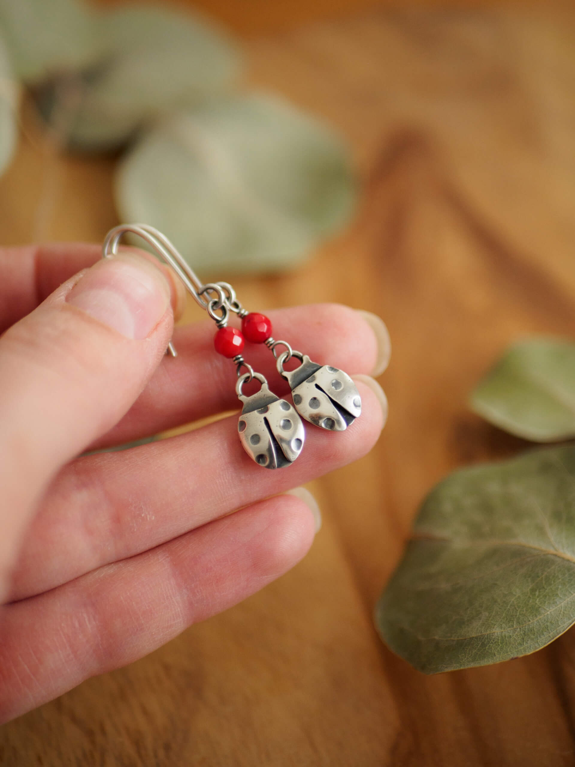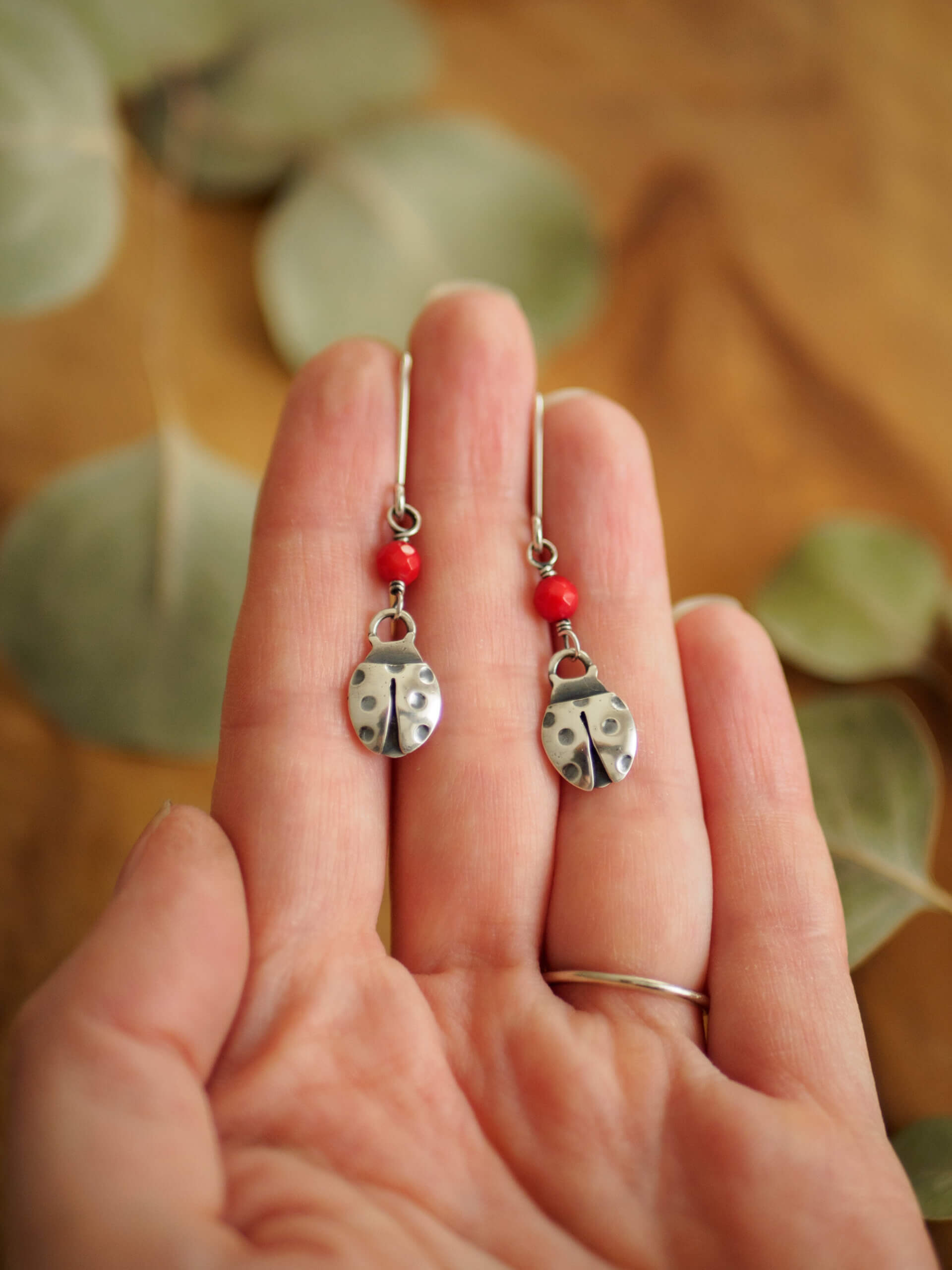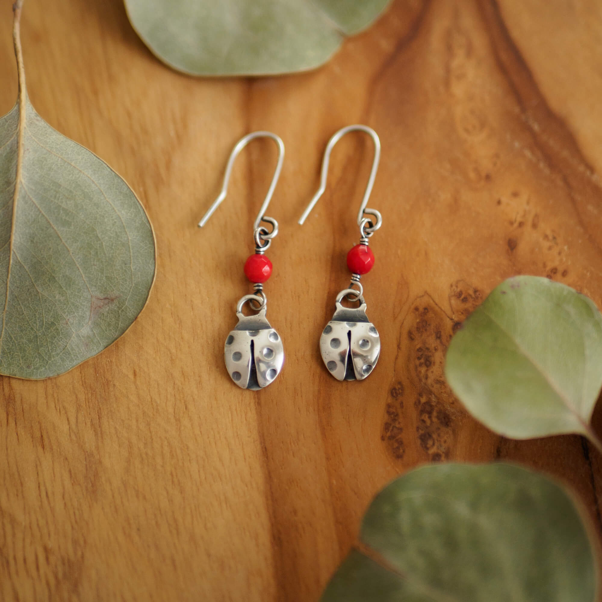 Biedronki to minimalistyczne kolczyki ze srebra w kształcie biedronek, ozdobione fasetowanymi kulkami czerwonego koralu.