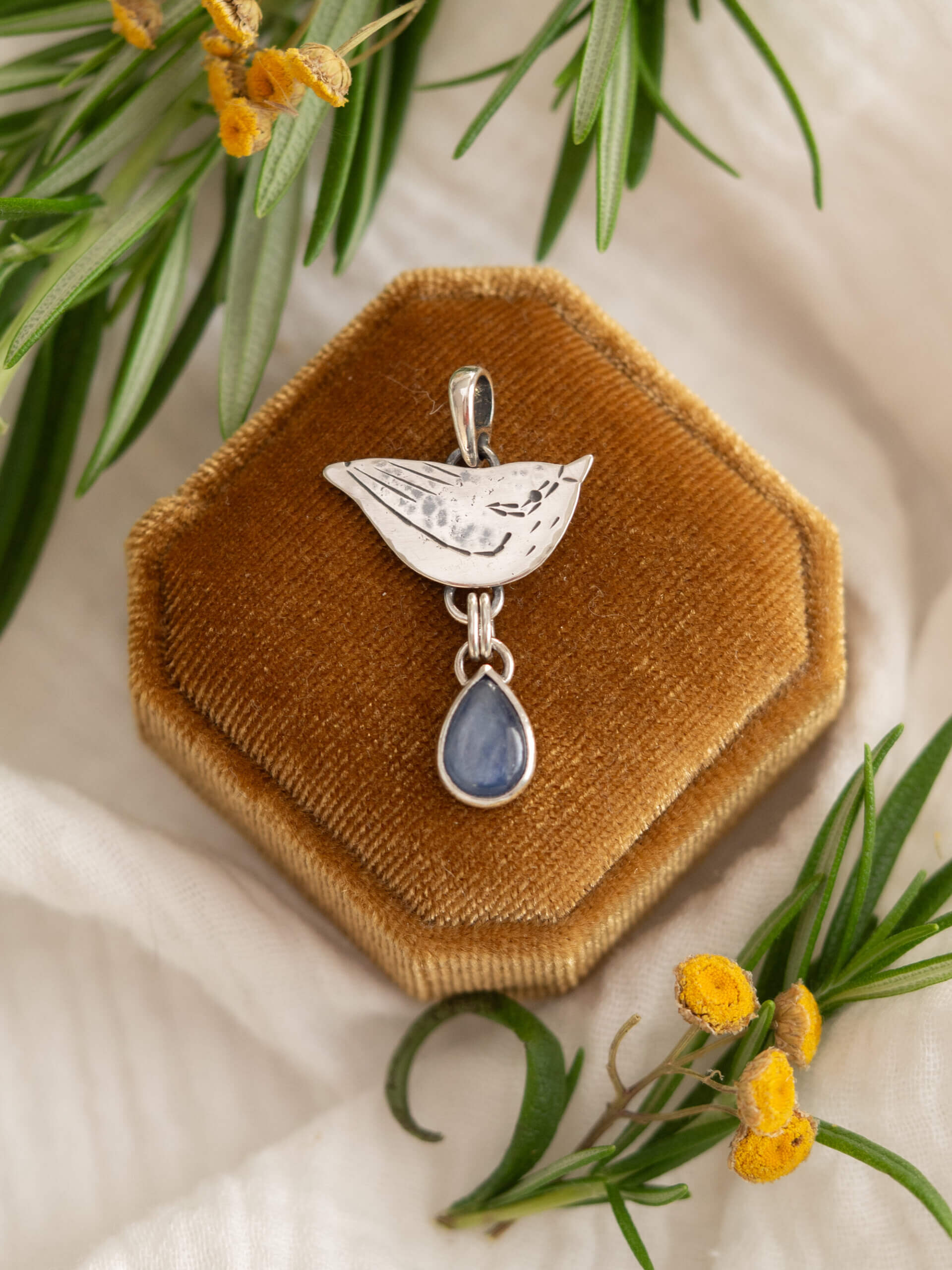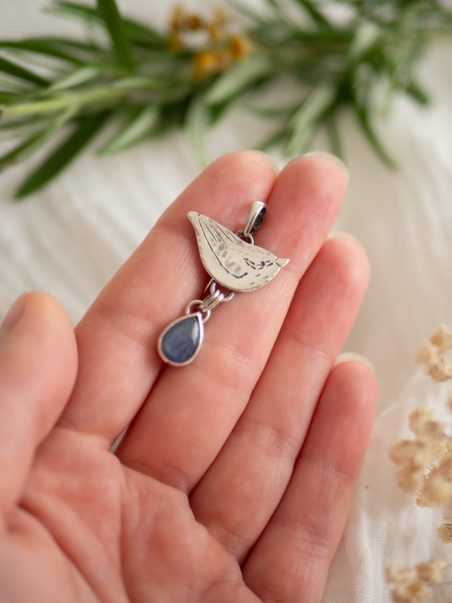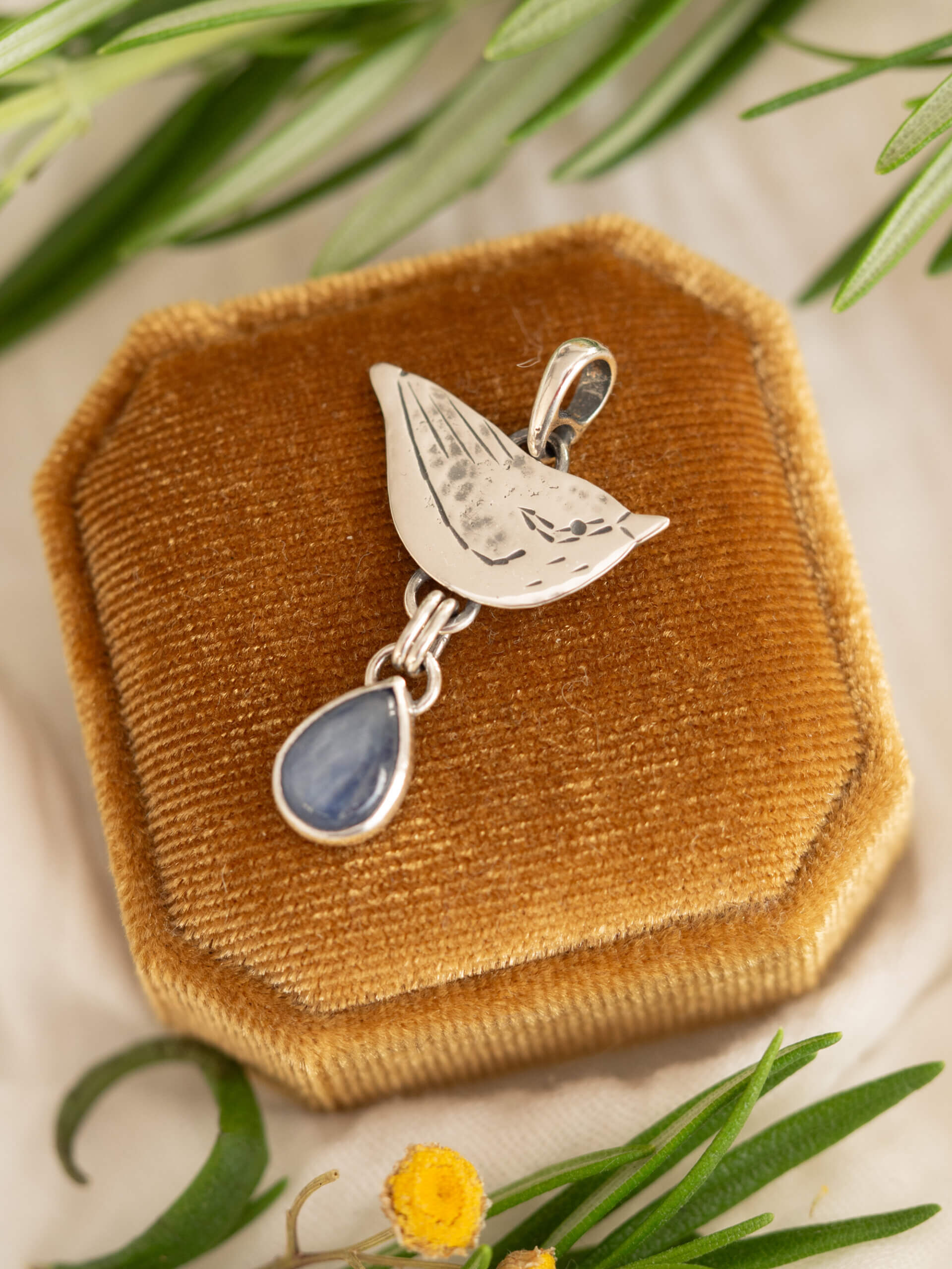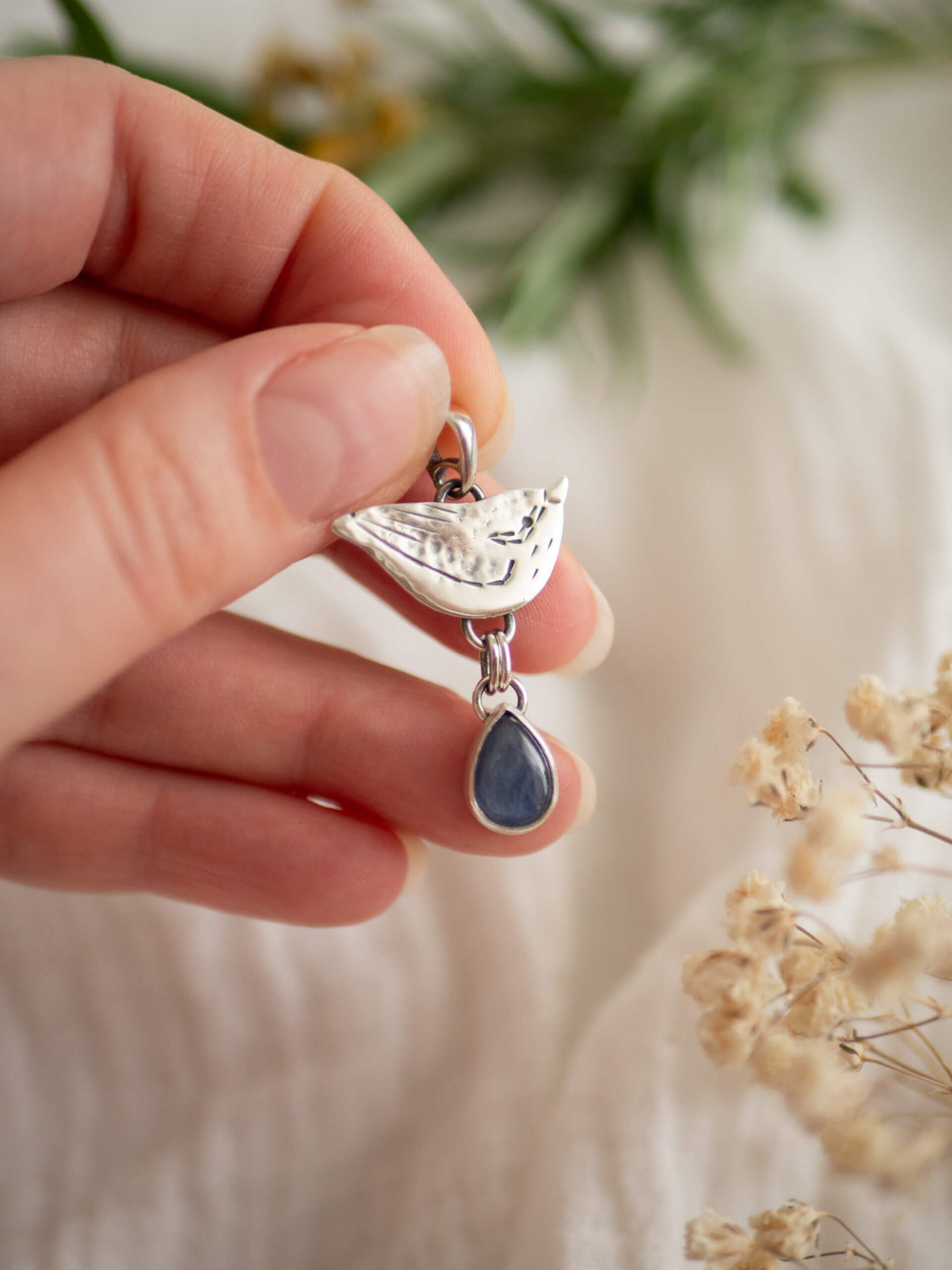 Kowalik to delikatny wisiorek wykonany ręcznie ze srebra w kształcie niewielkiego ptaszka.