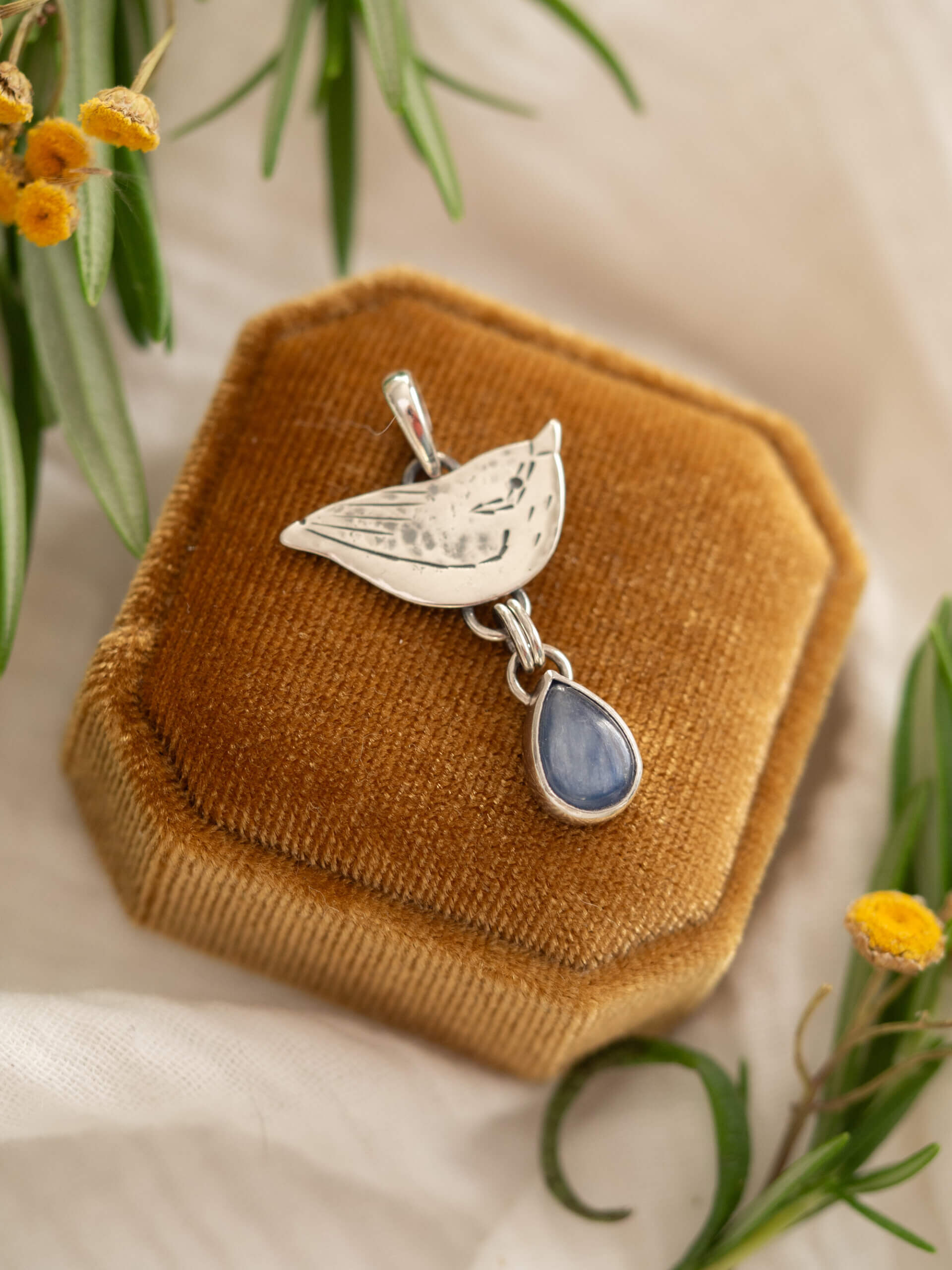 Sylwetkę ptaka ozdabia zawieszona u dołu kropla kyanitu w błękitnym odcieniu.