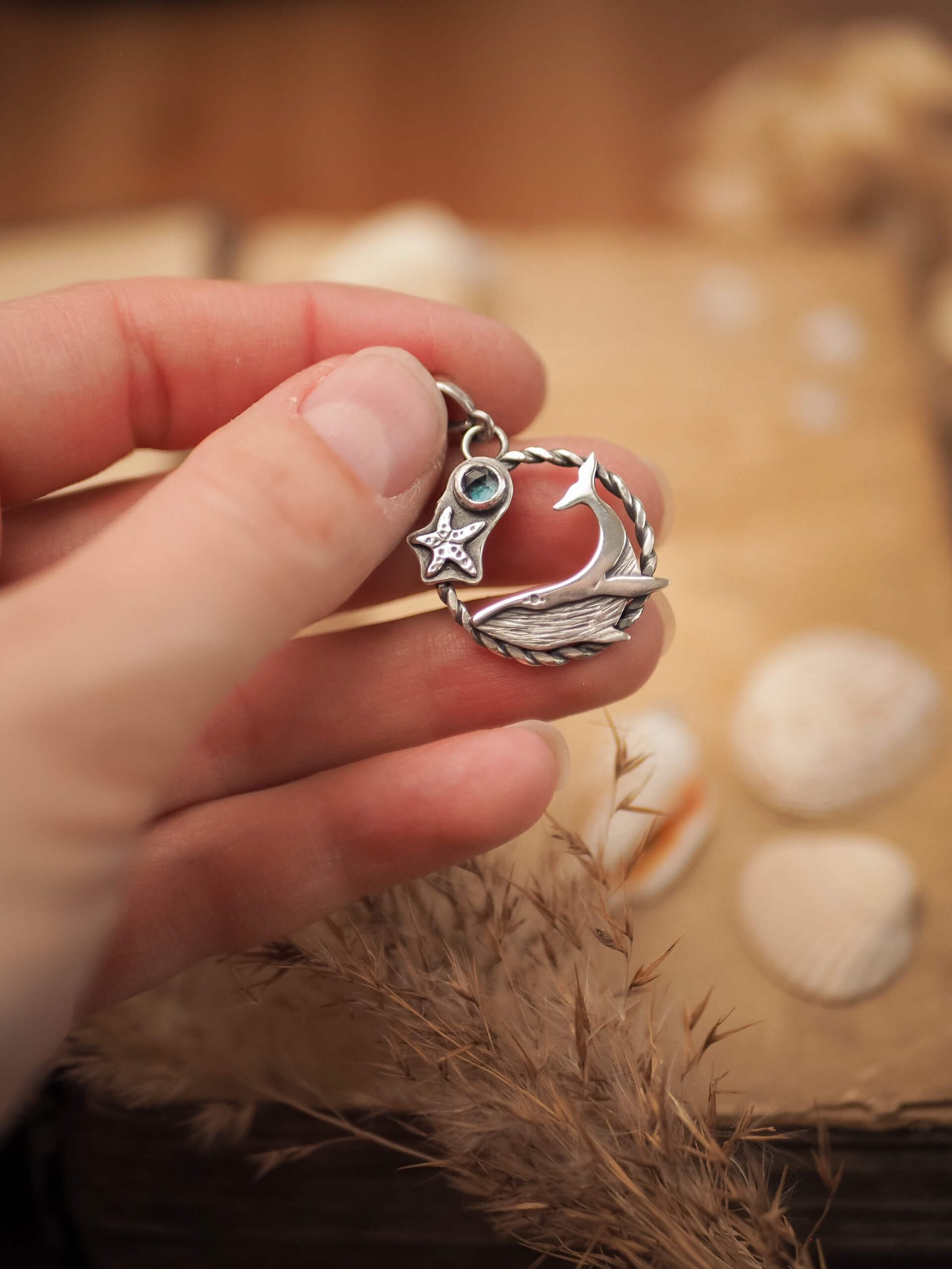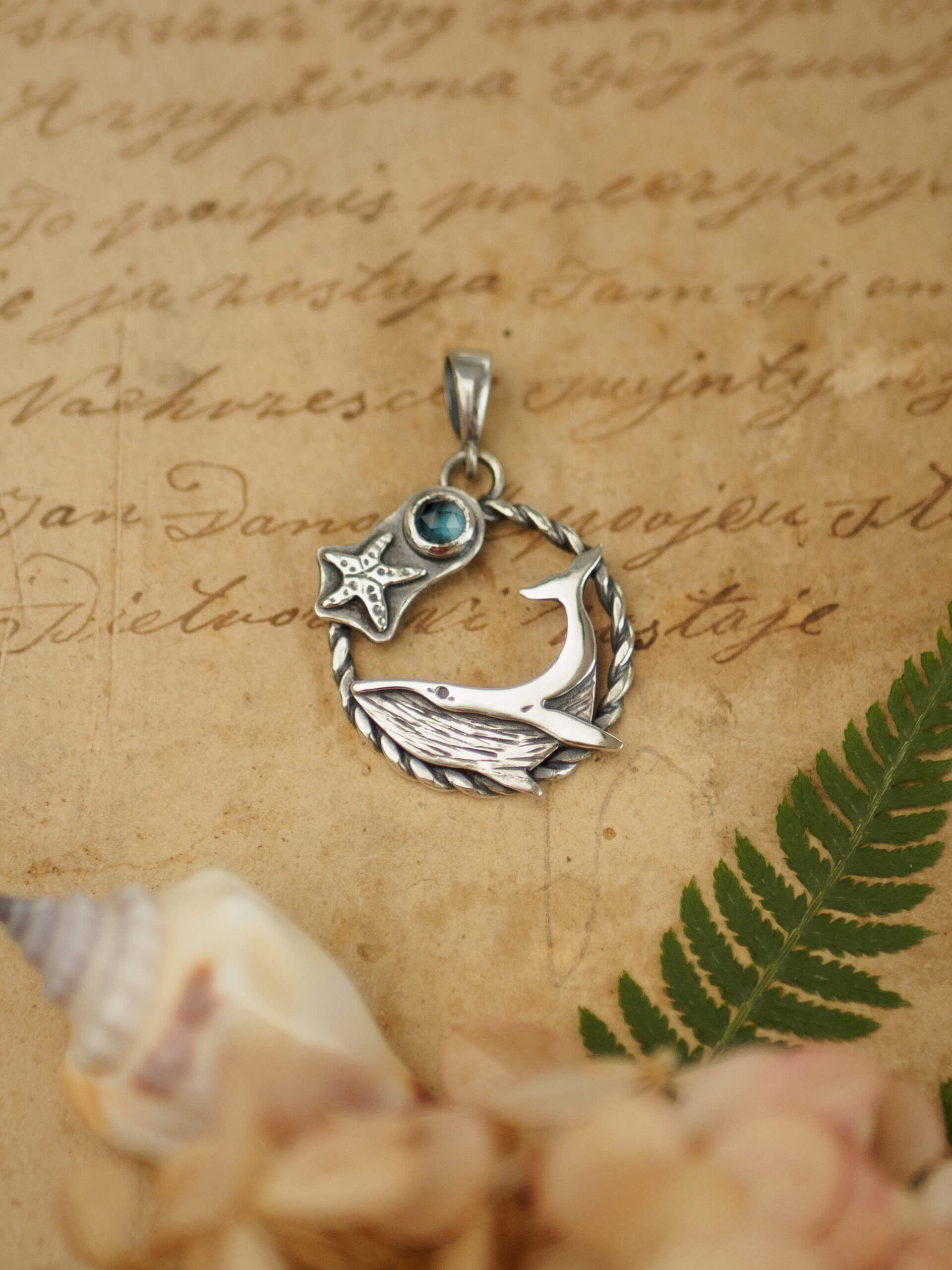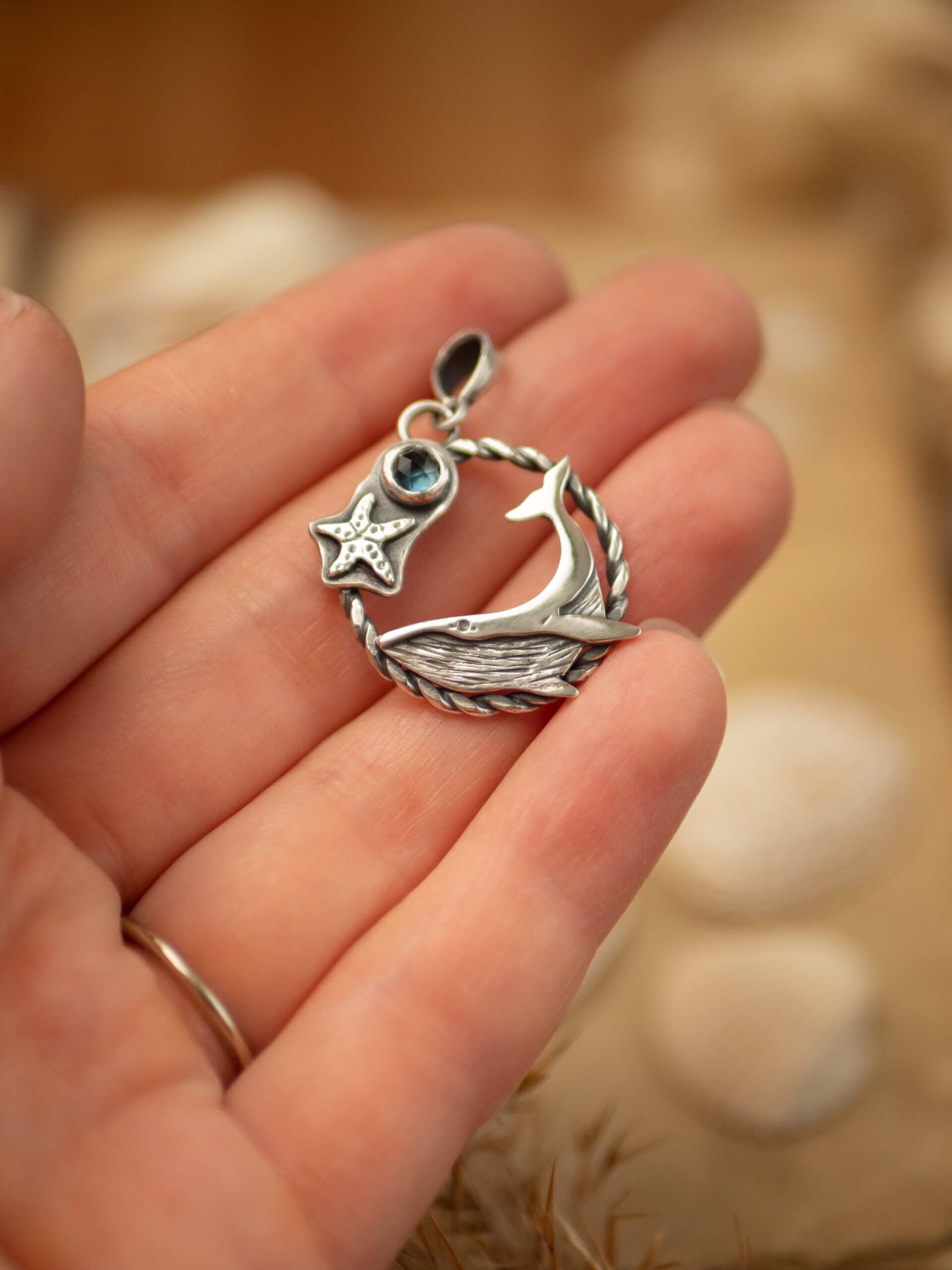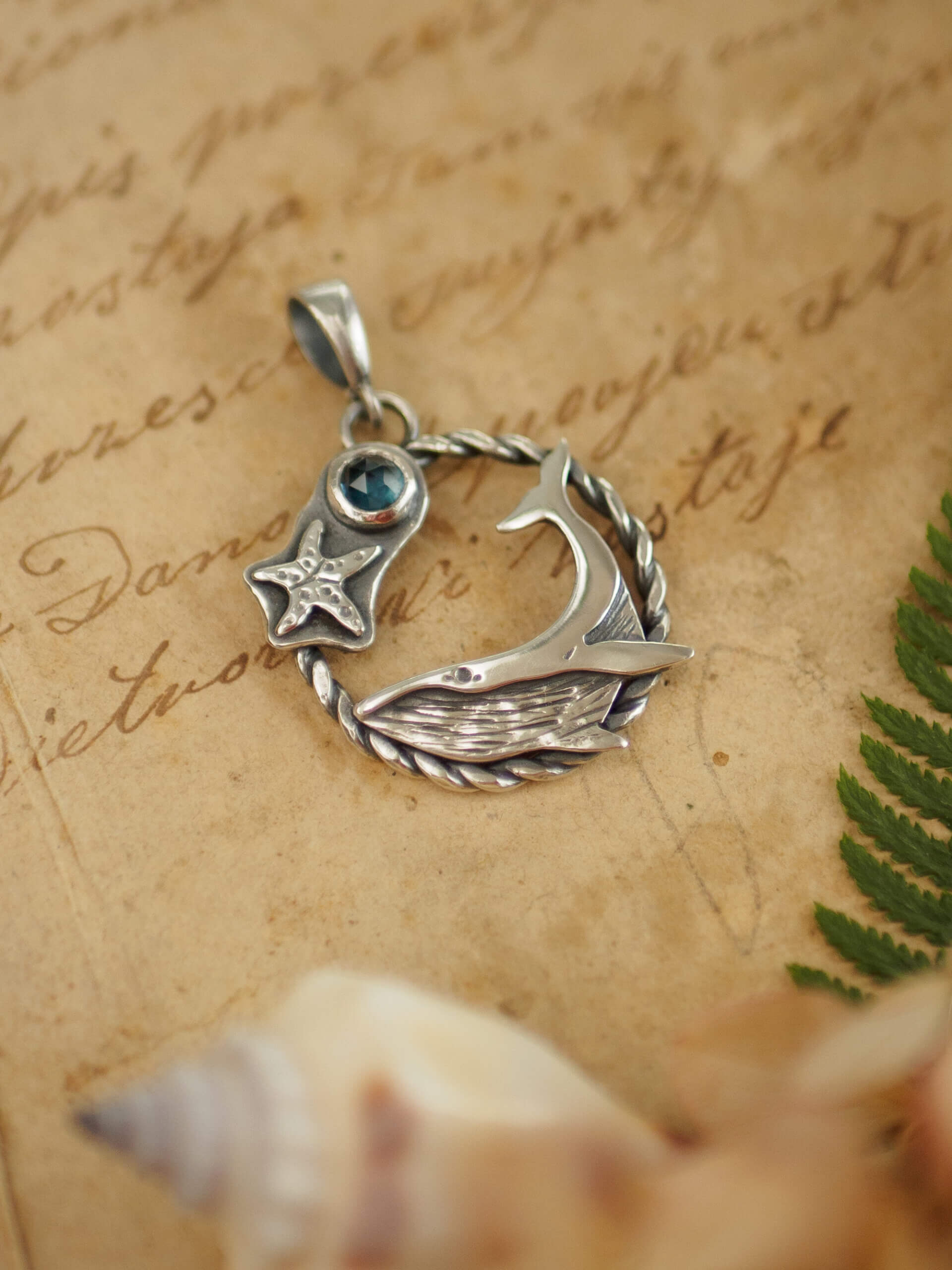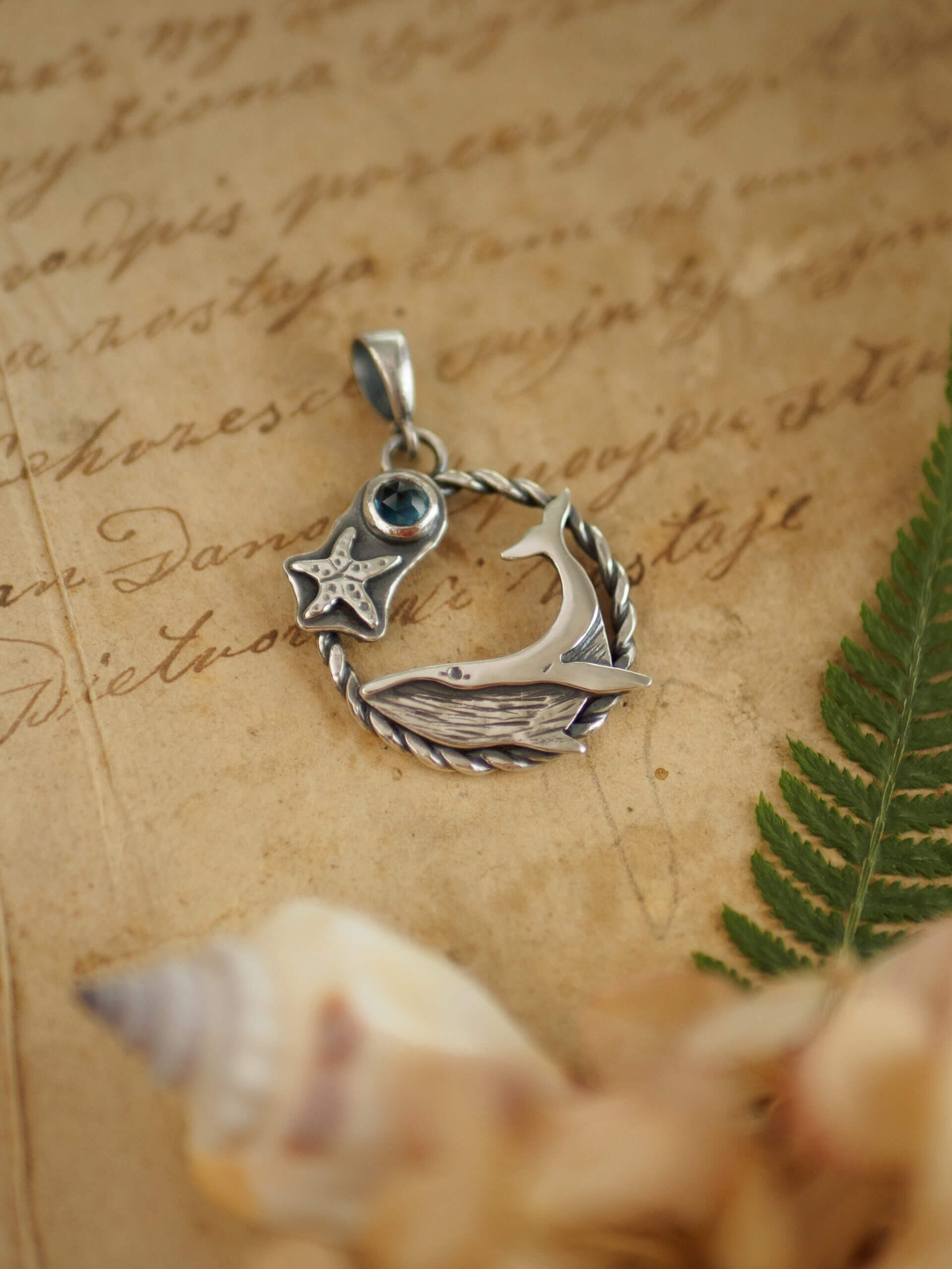 Wieloryb i rozgwiazda to wisiorek w formie okrągłego medalionu z sylwetką wieloryba. Od góry dopełnia go niewielki fasetowany topaz w ciemnoniebieskim odcieniu London blue oraz malitka srebrna rozgwiazda.